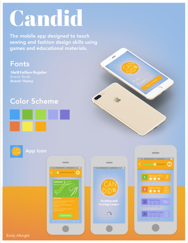 The goal of this project was to design the interface for an app made for kids to learn basic sewing and fashion skills. I wanted the interface to look fun, friendly, and cute. If I were to re-do this project today, I would make sure to adjust the colors to be WCAG 2.0 compliant.