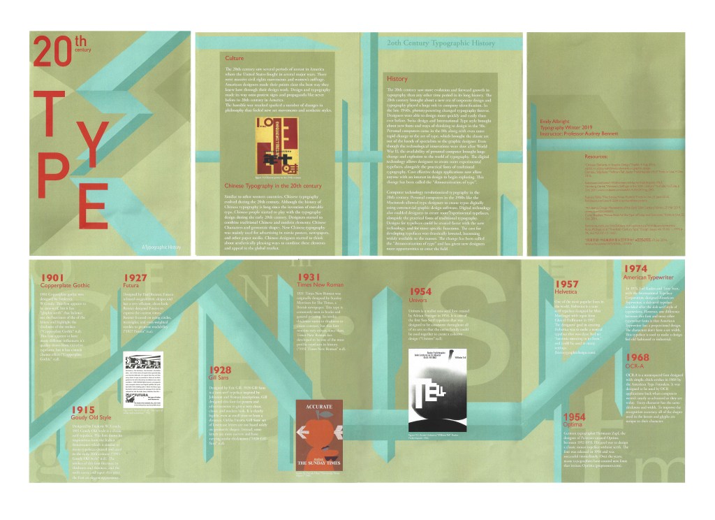 This spread covers popular typefaces from the 1900’s to the mid 1950’s. I typeset all text included and designed all the graphics. I also carefully considered contrasting and analogous colors to enhance readability.