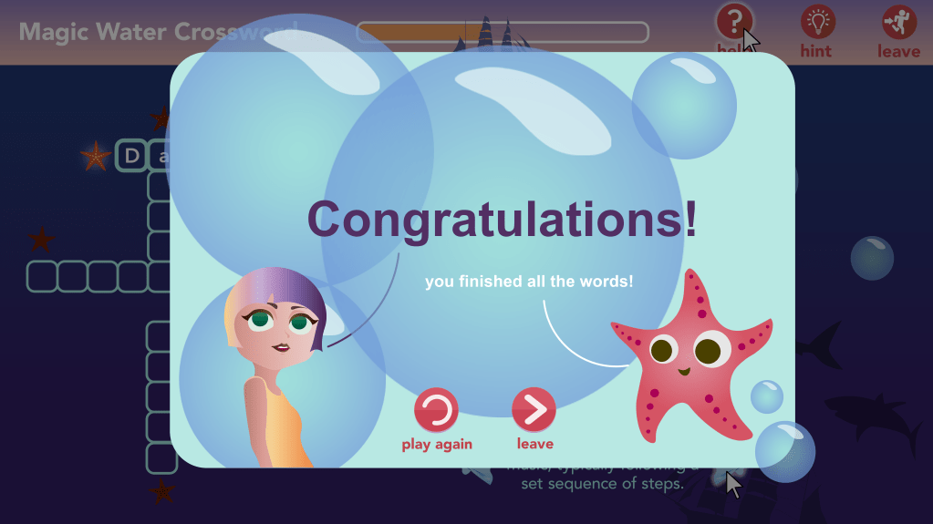 This is a collaborative project with both a front end and back end development team over the course of two semesters. Together, we are creating an interactive online crossword puzzle game that is under water themed.