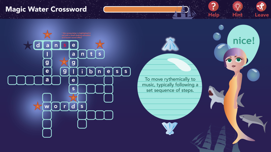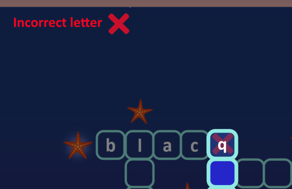 We would also like to include audio clips for incorrect feedback and a progress animation involving stars lighting up with each correct word.