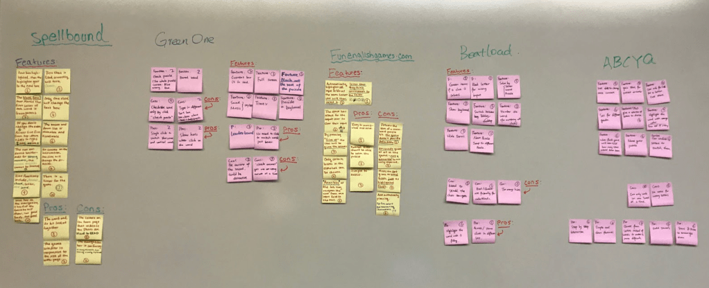 We analyzed the 6 competitors by evaluating their features’ pros and cons. We wrote these points on the sticky notes and evaluate them on the whiteboard.