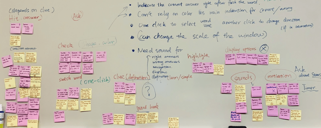 We rearranged the sticky notes and categorized them by features. We came out with Check, Switch Word Clue, Word Bank, Highlight, Display Options, and Sounds Motivation.